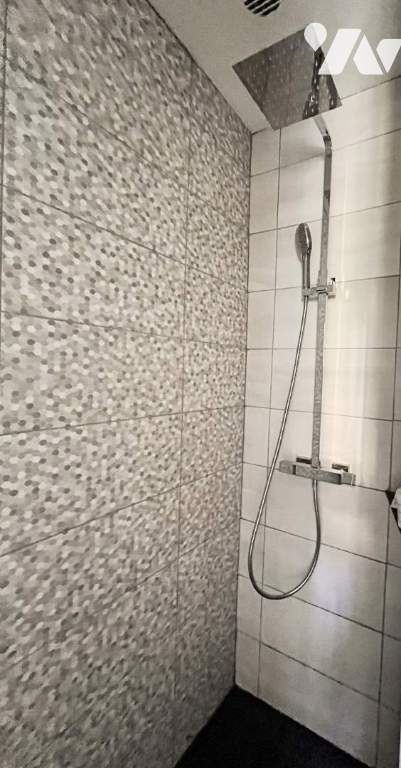 * Une salle d’eau à l’étage avec douche à l’italienne et meuble vasque et étagères de rangement